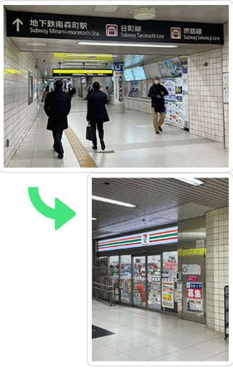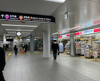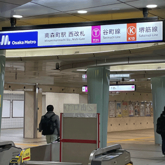 ドラッグストアのココカラファインを右手に通過して、谷町線と堺筋線の改札口を右手に折れると |