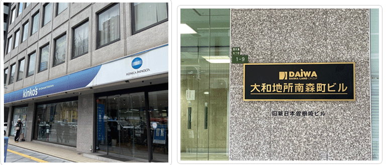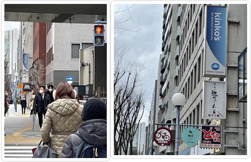 短い間隔で2つ信号を渡るともうすぐ着きます。キンコーズの看板があるビルです。 |